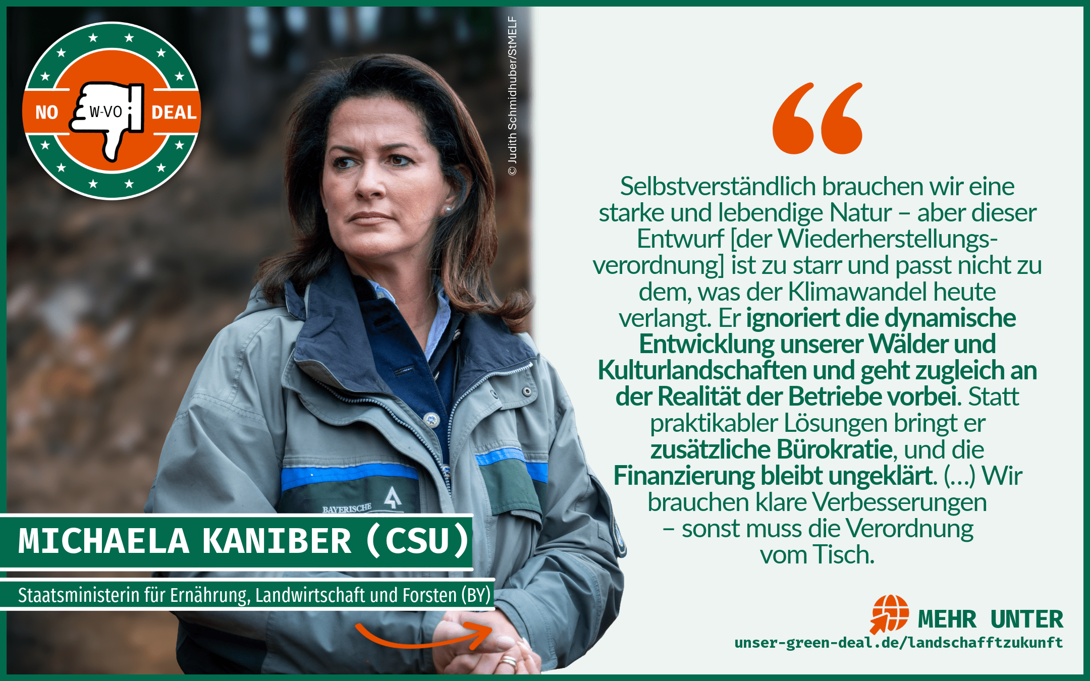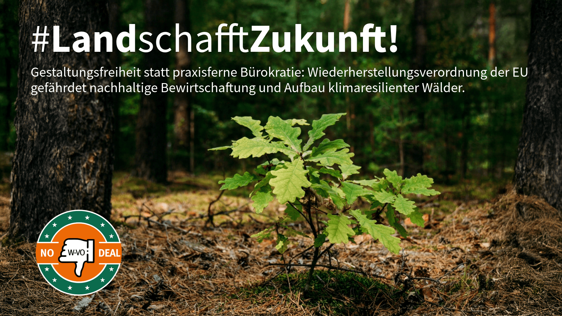 Neben dem inhaltlichen Kampagnen-Claim #LandschafftZukunft! wird mit NO DEAL auf plakative Weise die klare Ablehnung der W-VO in ihrer jetzigen Ausgestaltung zum Ausdruck gebracht. In Anlehnung an den Green Deal als Ursprung der Verordnung sagt die Land- und Forstwirtschaft NO DEAL zur W-VO. Kombiniert wird die Botschaft mit dem gesenkten Daumen als verbindende Kampagnen-Geste.