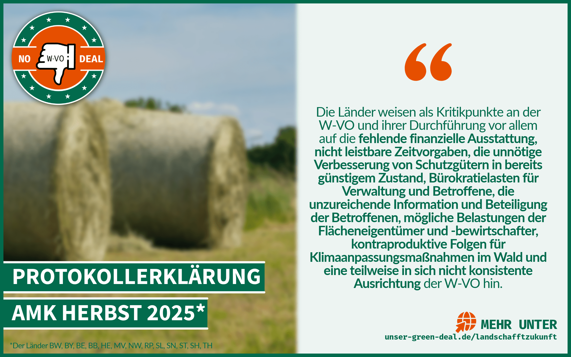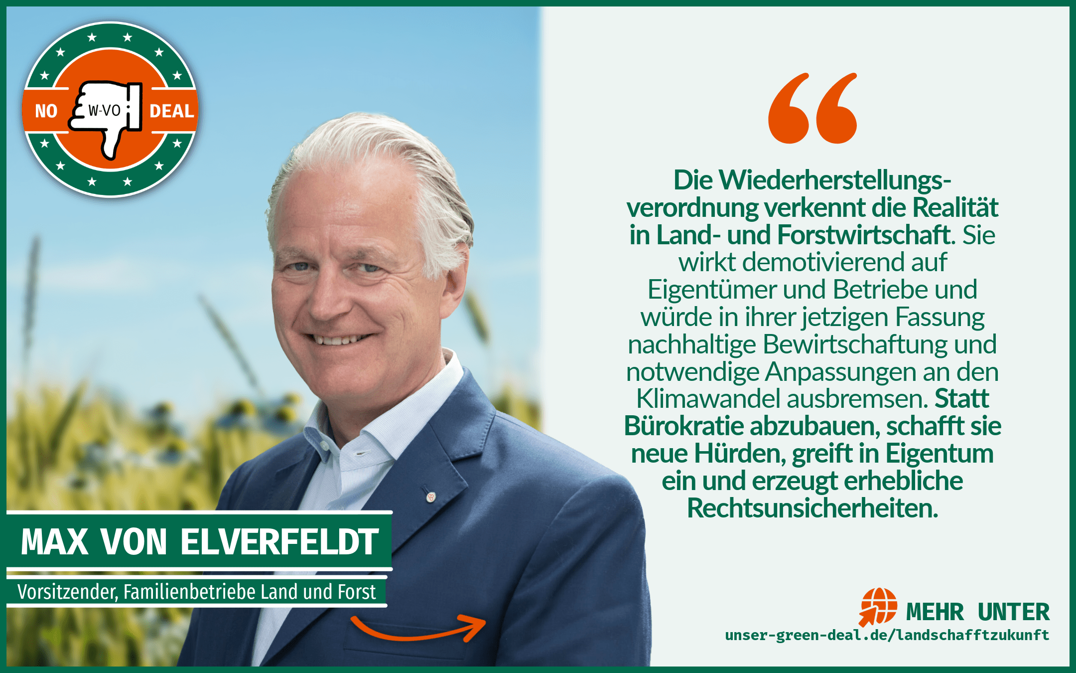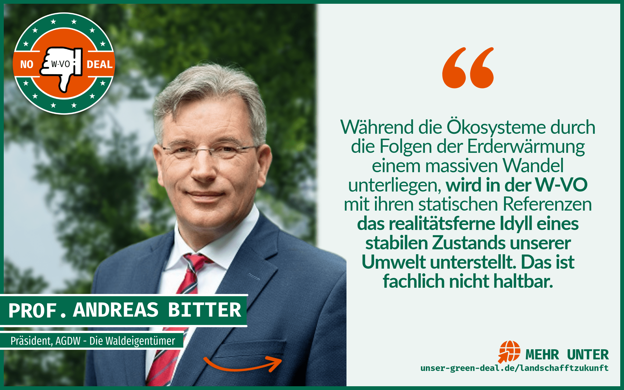 Machen Sie mit! Teilen Sie die Inhalte aus dem Download-Bereich! Noch besser: Schicken Sie uns für unsere Social-Media-Kanäle ein Handyvideo an info@no-wvo-deal.de. Zeigen Sie uns, wie der ländliche Raum die Zukunft unseres Landes gestaltet, wie Aufforstung, Bewirtschaftung und Generationendenken vor Ort aussehen. Und machen Sie gerne am Ende des Videos unsere verbindende Kampagnen-Geste mit dem gesenkten Daumen.
